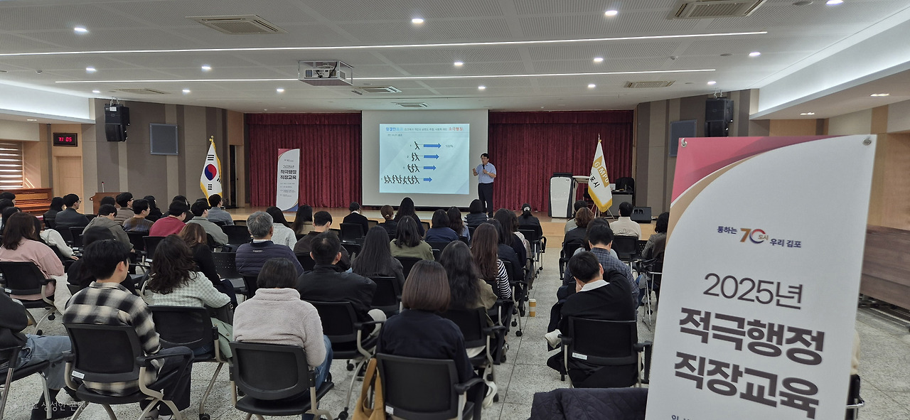 [김포시소비자저널=홍완호 대표기자] 김포시(시장 김병수)가 지난 12일 시청 본관 3층 대회의실에서 김포시 공직자 및 지방공공기관 등 직원을 대상으로 ‘2025년 적극행정 직장교육’을 실시했다. 이날 현장에 참석하지 못한 직원들을 위해 IPTV 내부망 생중계도 병행해 보다 많은 직원이 참여할 수 있도록 했다.