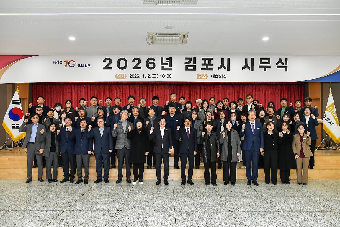 이날 시무식에는 김병수 김포시장을 비롯해 실·국·소장, 부서장 등 간부 공직자 100여 명이 참석해 새해 시정 운영 방향을 공유하고, 시민 중심의 시정 추진과 새로운 도약을 향한 결의를 다졌다.