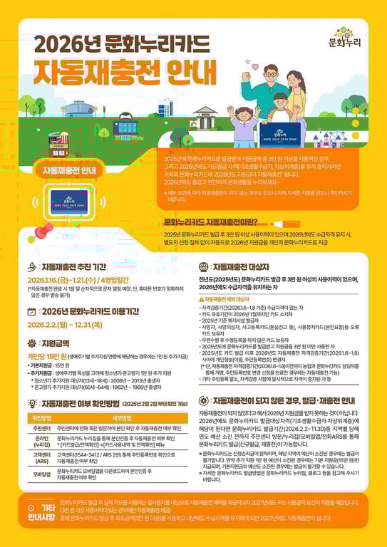 자동재충전 대상은 2025년 문화누리카드를 발급받은 자 중 3만 원 이상의 사용 이력이 있으며, 2026년에도 수급 자격을 유지하는 자로 한정된다. 해당 조건을 충족하면 별도 신청 절차 없이 자동으로 충전되고 1월 중 완료 문자가 발송될 예정이다.