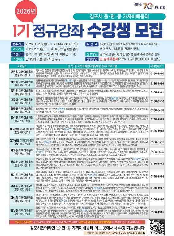 [김포시소비자저널=홍완호 대표기자] 김포시(시장 김병수)는 시민의 평생학습 참여 기회를 확대와 지역 밀착형 학습 환경 조성을 위해 2026년 읍면동 가까이배움터 제1기 수강생을 모집한다고 밝혔다.
